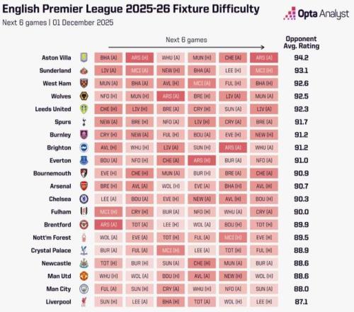 12月2日,数据机构Opta计算了英超各队未来6场联赛的赛程难度,其中阿斯顿维拉的难度是最高的,而近况不佳的利物浦赛程难度则是最低的。